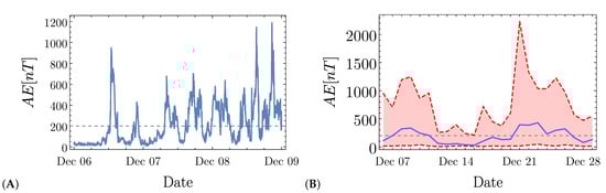 The Auroral Electrojet index is obtained with minute resolution from the OMNI database provided by the National Aeronautics and Spatial Agency (NASA). Figure 2 shows an example of the index behavior. In panel (A), we show the index for three consecutive days (6 December–8 December 2016). It is possible to observe the intermittent dynamics of the index, displaying large fluctuations. As mentioned above, the event statistics of seem to follow a power-law distribution [25], so that a clear threshold value between quiet and active periods might be difficult to define. The dashed horizontal line indicates nT, the value we used as the threshold that separates quiet and active times. In panel (B), we display the highest, lowest, and mean values of the index averaged to a 24 hour period, plotted from 6 December to 29 December 2016. Even at this scale, we observe large fluctuations of the values of the series. We note that the threshold of 200 nT is consistent with the daily averaged value of , so that in our study, we rate the magnetosphere as “active” when nT and “quiet” otherwise.
