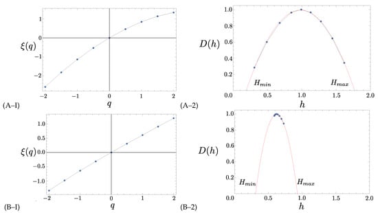 In Figure 3, we show how the analysis is applied to the center (C) component of the magnetic field in the NEC coordinate system, for two instances along the satellite trajectory. Here, we ask the code to find , for , but only keep the values of q that satisfy the restrictions. The first instance (panel (A–I) and (A–2)) was chosen on March 9, 2016 at 03:00:48 when the satellite was above coordinate (lat,long) , while the second instance was picked on 9 March 2017 at 10:48:13 with coordinates . The length of the intervals used for the calculation is the same as discussed above, namely 256 consecutive values. First, we calculated for the two intervals (left panels of Figure 3). In these figures, the variation to the straight line represents a quantitative notion of multifractality, so that the bottom one (Figure 3B–I) is quite monofractal, while the top one (Figure 3A–I) is significantly more multifractal. To quantify the variation, we perform the Legendre transformation and compute the singularity spectrum (left panels) for the two instances and see that indeed the top one (Figure 3A–2) is much more multifractal than the bottom one (Figure 3B–2). From these spectra, we can define the Hurst exponent , and the singularity spectrum width . These two values are provided by extrapolation (see references described above for details). The values H and will quantify the different intermittent regimes. For example, the larger the , the more multifractal the fluctuations are. Similarly, H quantifies the relevance of persistence vs. randomness of the main fractal component of the fluctuations. For , the dynamic is virtually Brownian, with a slight but sensible tendency to be anti-persistent, which is reminiscent of a system trying to acquire statistical stability under a complex forcing environment. Note that in this case, the observed values of H are greater than zero ().