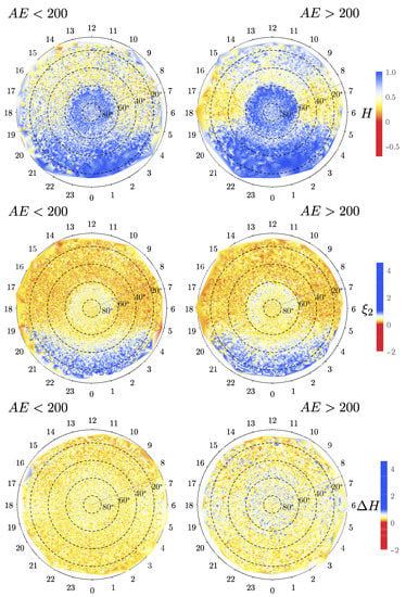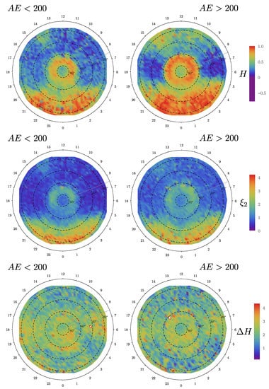 In particular, we analyze the spatial variation of the multifractal features associated with the complex state that appears under quiet and active conditions, as determined by the Auroral Electrojet () index level. It is common to characterize the geomagnetic activity in the polar region with this index. This index is derived from the difference between the upper and lower part of the envelope of the magnetic field measured in stations near the North Polar Circle at ground altitude [32]. There is no consistent definition of active and quiet periods for the geomagnetic activity, so many threshold values have been used in the past. Probably this is related to the self-similar (power-law distribution) event statistics of the Index [25], so defining such a threshold value may be difficult to do. For example, De Michelis et al. [9] separated quiet periods with nT and active periods with nT. Another consideration has been taken to define high-intensity, long-duration, continuous activity (HILDCAA) events that have been proposed by [33]. During these events, is maintained above 200 nT. This definition has been used by [34] and later by [35]. Therefore, here we use the arbitrary value of nT to separate the quiet and active periods, but of course, other values can be used. Below, we will provide an additional argument for the nT threshold.