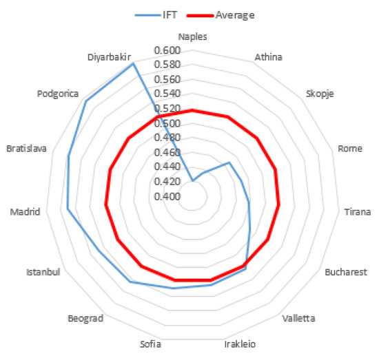 • Group 3: I F T [ I F T ¯ s ( I F T ) ; I F T ¯ ) represents a medium–low level of socioeconomic phenomena;