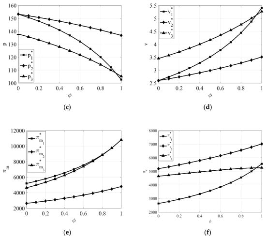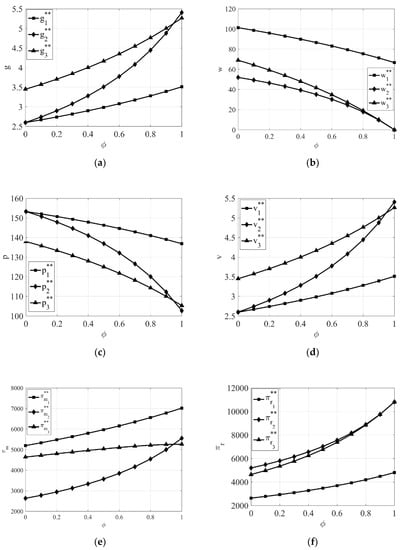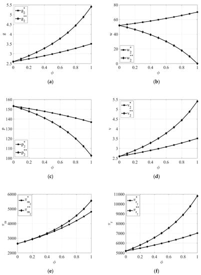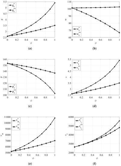 Corollary 5 shows that no matter under which kind of power structure, the product green degree, the green promotion investment, the manufacturer’s profit, the retailer’s profit, and the whole supply chain’s profit are all positively related to the intensity of the manufacturer’s awareness of CSR, while both the retail price and the wholesale price are negatively related to . This suggests that the stronger the manufacturer’s awareness of CSR, the higher the product green degree, the manufacturer’s profit, the retailer’s profit, and the total profit of the supply chain are, and the lower the retail price and wholesale price are. This is because when the manufacturer has a sense of CSR, as in the case when the retailer has a sense of CSR, it chooses to reduce the wholesale price and improve the product green degree out of special attention to consumer surplus. At the same time, affected by the manufacturer’s awareness of CSR, the retailer chooses to increase investment in product green promotion and further reduce the retail price. In addition, the above phenomenon also shows that regardless of the power structure, it is beneficial for all members of the supply chain and the entire supply chain when manufacturers take CSR. The proofs are shown in Appendix C.