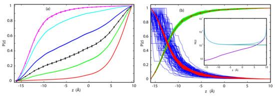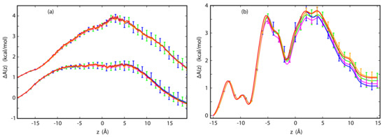 If we abbreviate the number of crossing events in forward and backward direction as and , respectively, then, assuming that crossing events are governed by the Poisson statistics, the corresponding errors will be approximately and . This means that if or is small, calculated from Equation (12) may become inaccurate. Thus, we developed another, related theoretical approach for determining the PMF from non-equilibrium simulations that does not suffer from this disadvantage. Since it requires calculating committor probability, , we will call it the Committor Probability Method (CPM). For a diffusive process considered here, referenced to the forward direction is defined as the probability that a particle (ion) in position z will reach before it reaches . can be calculated either directly during computer simulations or in post-processing, as described in Supplementary Materials, Section S3. A general discussion of committor probabilities in more than one dimension and their application to chemical kinetics can be found elsewhere [78,79,80,81].