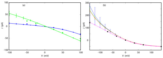For p7, the agreement is not as good if the the reference voltage of 140 mV is used for calculating the I-V curve. The Cl currents calculated directly and from Equation (18) agree well for positive voltages, but diverge for negative voltages, away from the reference state. The corresponding statistical errors also increase and become quite large below −50 mV. The source of this disagreement can be traced to the integrand in Equation (18). As the difference between the reference and the target voltage increases, the exponential term also increases, which magnifies inaccuracies in function . If the reference voltage is chosen to be mV, the agreement over the full range of voltages −150 to 150 mV improves markedly, with modest deviations only at high, positive voltages (see Figure 4). A similar situation was observed for GLIC. For the reference voltage of 100 mV, the I-V curves at the N7 level satisfactorily reproduce currents calculated directly for positive voltages. For negative voltages, the performance of the method progressively deteriorates. Again, if one is interested in an I-V curve that extends to both positive and negative voltages, a different choice of reference voltage may yield significant improvements in accuracy.