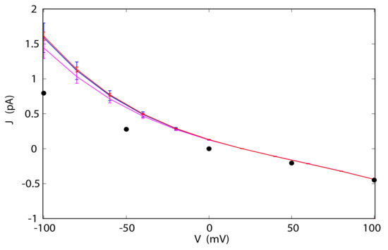 Once and , which are both assumed to be independent on voltage, are known, the boundary density terms and have to be obtained from either MD or stochastic simulations at each voltage of interest. Since the full knowledge of is not needed, these simulations can be markedly shorter than simulations to determine the PMF. Then, , , and are used in Equation (5) to calculate J at a given voltage. Previously, we demonstrated that this method performs satisfactorily for simple channels [19,24,25].