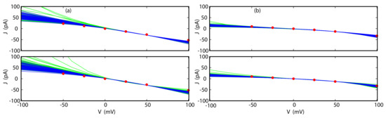 Reconstructions of I-V curves in TTX from individual sets of trajectories for K (a) and Cl (b). The PMFs were obtained from CPM (upper panels) or CWDM (lower panels). The curves were calculated by way of Equation (20) (blue) or Equation (18) (green). All reconstructions were carried out from simulations at applied voltage of 50 mV at the N6 level. Note that blue curves, but not green curves, are tightly clustered together indicating that Equation (20) is more accurate than Equation (18).