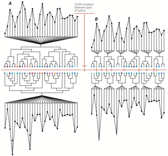 The emergence of quantum correlations. Illustration of the three steps process (TSP) leading to quantum correlations. Two sets of raw data (black dots) are clustered into two dendrograms each containing 30 edges (A). The same data were clustered into two sets of six dendrograms each with five edges (B). Colored spheres represent the 2-adic values of an edge route in the dendrogram.
