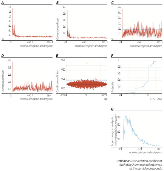 Quantum correlations from classical data and the transition from quantum to classicality. The emergence of quantum correlations and transition to classicality is a. consequence of the TSP: (A) significance of correlation between two sets of quantum potential values versus number of edges in unit dendrogram. Values were calculated for each unit dendrogram with fixed number of edges (N = 3, 4, 5…980) after which two temporal halves of quantum potential values were then cross-correlated. (B) correlation coefficients of the two sets of quantum potential values versus number of edges in unit dendrogram. (C) significance of correlation between two sets of p-adic values versus number of edges in unit dendrogram. Values were calculated for each edge route in unit dendrogram (as described in Section 3). (D) correlation coefficients of the two sets of p-adic values versus number of edges in a unit dendrogram. (E) correlation between detectors of real bell experiment. (F) fraction of CHSH values versus CHSH values. CHSH values were calculated for each possible pair of p-adic values obtained from two halves of the diffraction data divided by unit dendrograms of size N = 5…86. (G) The proportion of p-adic pairs that produce CHSH values which violate the CHSH inequality versus number of edges in a unit dendrogram.