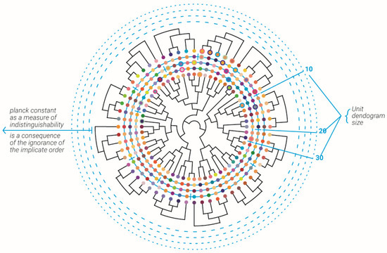 Let the whole “Universe” be represented as a giant dendrogram in which all of the information in that universe is present at the circumference with no dynamics, and inside the circle, the dynamics of information emerges (Figure 3). Now, it was suggested that Planck’s constant represents a fixed amount of information bits [32,33,34]. This complex dendrogram with all information is contained in the edge’s routes at which the edges are on the horizon (of the dendrogram). When coarse grain edges of the dendrogram are started or rather used in only a disconnected fashion, detached sub-dendrograms of the complex “Universal” dendrogram dynamics emerge.