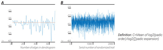 The universal dendrogram was coarsely grained by joining fixed number (Figure 4a)/random number of edges (Figure 4b). The ratios between “p-adic order of edges”/”sum of p-adic-expansion” was and for fixed number of edges and random number of edges, respectively, which was approximately the ratio of: