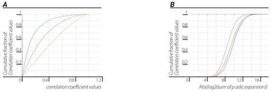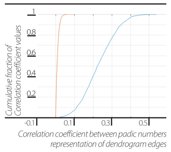 Implicate order encoded in explicate order. Cumulative distribution function (cdf) of correlation between the same events represented as 2-adic values in dendrograms of different sizes N = 5...3920 (blue line) and cdf of the correlation between different events represented as 2-adic values in dendrograms of different sizes N = 5…3920 (orange line).
