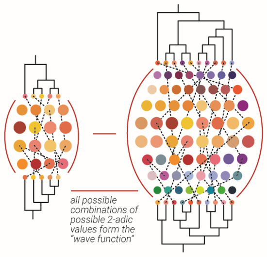 Measurement of the wave function according to maximal variety principle. An abstract example of measurement of the wave function which is the ensemble of possible combinations of possible 2-adic values, which is illustrated as a collection of colored spheres between two dendrograms. The maximal variety principle suggest both dendrogram on each side of the “wave function” should be maximally different.