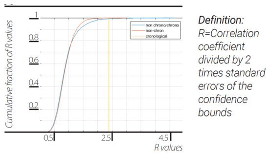 Reconstruction of space-time intervals. Correlation coefficient divided by 2-times the standard errors (SE) of the confidence boundaries of reconstructed spacetime intervals from randomized walk on full dendrogram edges sequence correlated to its randomized real space time intervals (blue trace). cdf of correlation coefficiants of reconstructed spacetime intervals from randomized walk on full dendrogram edges sequence correlated to real chronological spacetime intervals (orange trace). Correlation coefficient value of the real chronological spacetime intervals correlated to the reconstructed intervals from chronological walk on full dendrogram edges (yellow vertical trace).