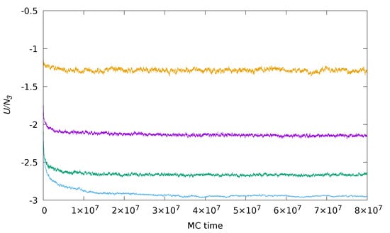 A property signalling how far the system is away from equilibrium is the total potential energy U: an energy fluctuating around a fixed value for long is the hallmark of (meta)stable equilibrium. In units, U gives the total number of 1–3 contacts in the current system configuration. Hence, a stationary value of U indicates that aggregates eventually reached a nearly stable structure. Typically, cycles suffice for reaching a stationary state of low density. This is clearly illustrated in Figure 1, showing the energy evolution as a function of Monte Carlo cycles for , and a number of compositions. Once equilibrium (or whichever steady state) is reasonably attained, we gain insight into the nature of aggregates mainly by visual inspection. We also computed the radial distribution function (RDF) of disks, in a rather long production run of cycles (we checked that statistical errors on the RDFs were indeed negligible). For the sake of comparison, similar studies of 2D binary mixtures at considerably higher total density were executed for one order of magnitude fewer MC steps []. Even in a strongly heterogeneous system where mesoscopic structures were present, bears valuable information on the arrangement of disks in the close neighborhood of a reference disk. Two disks form a bound pair when their distance is not larger than []: this is the maximal distance at which two disks can still be in contact with the same small monomer (exactly placed in the middle). For , this implies that a disk forms bonds with all its first and second neighbors, identified as such through the RDF profile.