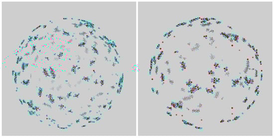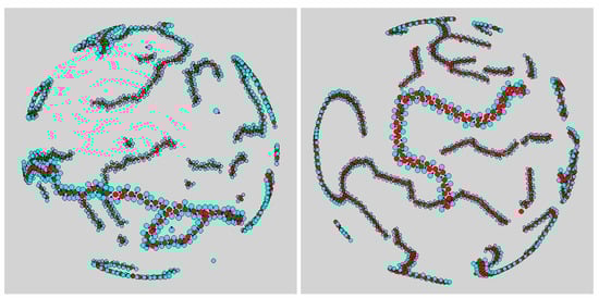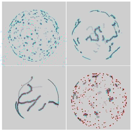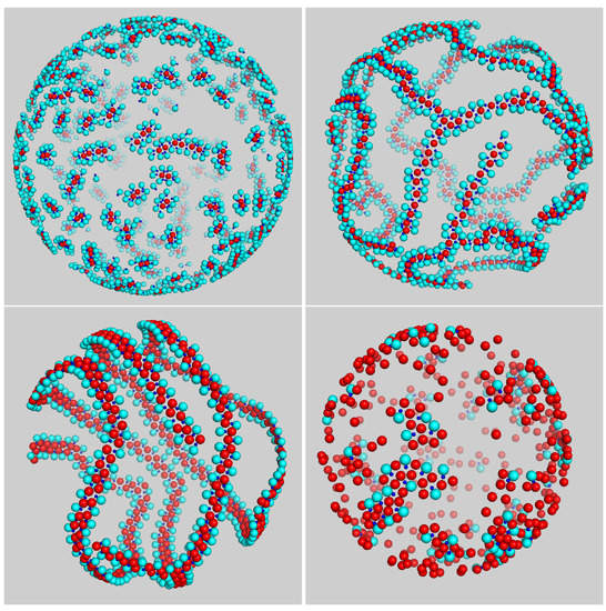 As density increases, the nature of self-assembly becomes slightly different. We studied mixtures for while still keeping and the temperature fixed at 0.10 (see Figure 6). When the composition was low, the aggregates were slightly elongated capsules (see top-left panel of Figure 3), like at small density. For , aggregates were definitely chainlike (Figure 6, top-right panel), but due to a more crowded environment, they were joined together in an intricate manner, giving rise to a spanning cluster (i.e., a connected gel-like network encompassing all particles in the system). The onset of an extended network is a remarkable outcome, considering that this structure emerged from very basic interaction rules in a binary system of disks and dimers. At the composition of 50%, large monomers were more effective in screening a chain from other aggregates, and chains then grew much longer. As a result, a chain may wrap a few times around the sphere before merging into another chain (see bottom-left panel of Figure 6). This is similar to what was observed in a one-component system of particles interacting through a short-range attractive, long-range repulsive (SALR) potential []. The latter system was stripe-forming at low temperature; hence, when the particles were constrained to a spherical surface, a stripe may wrap around the sphere, as indeed observed. Lastly, at still higher compositions of disks, the size of aggregates was again reduced since there were few disks to bind all dimers, and their environment was too crowded to allow for aggregates to grow long in the early stages of equilibration.