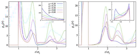 Figure 5 shows the collected RDFs for various compositions at low temperature (). A large value at contact is the most distinct signature of the existence of aggregates of disks. The short-distance structure in was richer for intermediate values, where the physiognomy of aggregates is better defined. The rather pronounced second-neighbor peak at was the result of the zig-zag structure of the chain backbone at this composition. Regarding , its short-distance profile was sharper for the lowest compositions, where the number of dimers that were in close contact with the same sphere was higher (see inset of right panel). A high third-neighbor peak for intermediate compositions is the signature of the existence of extended aggregates of dimers and guest disks consisting of a periodically repeating unit.