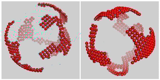 Particularly interesting are the systems with and , which are shown enlarged in Figure 4. Here, most of the aggregates are flexible worms, i.e., chainlike aggregates with a small bending modulus. The geometry of the worm backbone is dictated by the necessity to keep the energy as small as possible at the given composition: this was accomplished by a straight chain of disks for (Figure 4, left panel) and by a zig-zag chain for (Figure 4, right panel). Both chain morphologies allowed for disks to bind all dimers, so that, in the long run, no free particles would be left in the box. Occasionally, a worm bent to the point that a closed loop appears—see the example on the left in Figure 4.