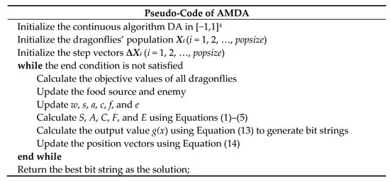 In order to demonstrate the mapping procedure, Figure 6 shows the procedure of using the modified trigonometric function to map a continuous five-dimensional search space into an n-dimensional binary search space. The main procedures of IAMDA are described as the following pseudo-codes given in Figure 7.