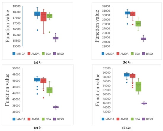 The box plots of IAMDA, AMDA, BDA, and BPSO on some selected large-scale problems. (a) k7. (b) k8. (c) k9. (d) k10. (e) k11. (f) k12.