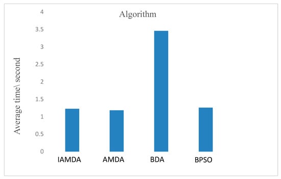 Average computational time of IAMDA, AMDA, BDA, and BPSO on some selected large-scale problems k7–k12 over 30 independent runs.
