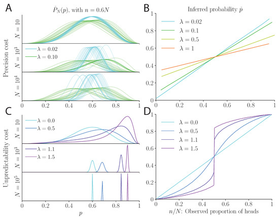 and n is the number of times ‘head’ is observed among a total of N flips. Because is obtained by raising to its Nth power, after a large number of coin flips, the inference is dominated by the maxima of . This function can have one or two local maxima, depending upon the value of the empirical bias, , and the weigth of the cost, . In the limit of large N, converges to a delta function centered at the inferred probability, , which is subjected to the fluctuations in the empirical bias, . This inference calculation leads to qualitatively different scenarios for a biased coin and a fair coin (we discuss the latter case in the next section).
