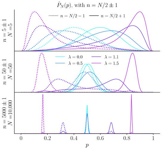 Inferred bias from a fair coin under the unpredictability cost. Inferred distribution for (top), 100 (middle), and 10,000 (bottom) coin flips, when the number n of ‘heads’ is plus one (solid lines) or minus one (dashed line), with the unpredictability cost. Depending on the sign of , the maximum of is greater or lower than 1/2. With more coin flips, for the two maxima (above and below 1/2) converge to 1/2. For , the two maxima stay separated, and thus the inferred probability can switch from one maximum to the other, depending on the fluctuations of n around .
