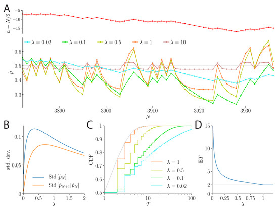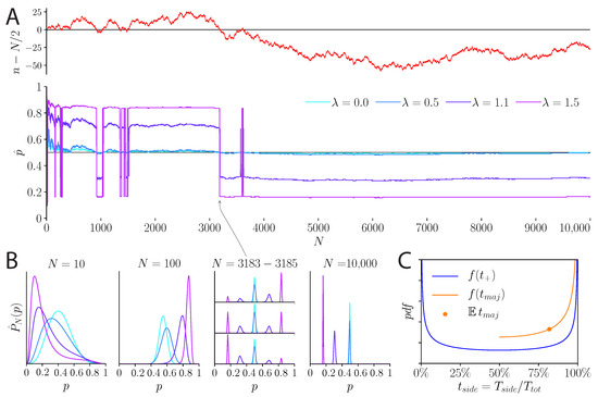Behavior of the unpredictability-cost model over 10,000 flips of a fair coin. (A) Top: Random walk described by the fluctuations of the number n of ‘heads’ around . The quantity has excursions of varying lengths above and below zero. Bottom: Inferred probability, , over the course of the 10,000 coin flips. Depending on the sign of , the inferred probability is above or below 1/2. For , converges to 1/2, while for it never converges but switches between two maxima, and , above and below 1/2. (B) Inferred distribution, , at various times during the course of the coin flips. From to , the density becomes narrower; it is subject to the fluctuations in the coin flips, but for the density approaches 1/2. For to 3185, the number of observed ‘heads’ goes from just above to just below. As a result, for the maximum at , above 1/2, decreases and the other maximum at increases, becoming the global maximum. For exactly , the density is symmetric and both maxima have the same height. For , there is only one maximum. Finally, for 10,000, in this instance the random walk is relatively far from 0; thus, for all , the distribution is concentrated around a maximum below 1/2. (C) Probability density function of the proportion of time spent on a given side—above or below 0—of the random walk, and on the most visited side. The density of the time spent on a given side, relative to the total duration of the random walk, follows an arcsine distribution (blue line). The extremes are more likely than the center, i.e., a random walk is not likely to spend around half of its time on a given side: it is much more likely to spend either a very long time or a very short time on this side. One side, the ‘majority’ side, will thus dominate. The proportion of time spent on this majority side has an arcsine density ‘folded’ on values above 50% (orange line). Its expected mean is 81.8% (orange dot), i.e., on average, unbiased random walks spend 81.8% of their time on one side.