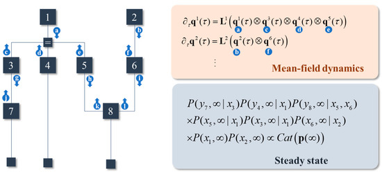 The implication is that any marginals corresponding to variables outside of the Markov blanket, under the steady-state distribution, add no additional information as to the steady state for the variable inside the blanket. As such, we can set the β coefficients from Equation (14) to zero for all terms except those exclusively comprising variables in the Markov blanket. Figure 2 shows an example of a generative model, expressed as a normal factor graph [34], that illustrates an interpretation of the associated dynamics as message passing among the posterior marginals.