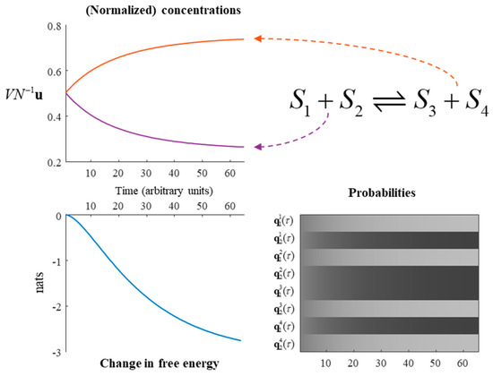 Equation (19) uses the ‘corrected’ β coefficient. A simulation of this reaction is shown in Figure 3, represented both in terms of the evolution of probability and as chemical concentrations. Note the gradual transition from substrates to products, under a generative model in which the latter are more probable. The free energy of this reaction can be seen to monotonically decrease, highlighting the consistency with the dynamics of Equation (7) despite the mean-field assumptions.