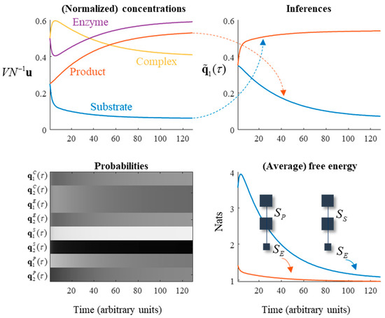 Figure 5. Enzymes, Markov blankets, and chemical inference. This figure illustrates several points. The plots on the left use the same formats as in Figure 3 to show the evolution of the reaction in terms of concentration and probability. The plots on the right exploit the Markov blanket structure implicit in an enzymatic reaction to show the evolution of the ‘beliefs’ implicitly encoded by the expected value of the substrate about the product, and vice versa. The upper-right plot shows these beliefs, defined as q ˜ 1 1 = α 2 q 1 2 and q ˜ 1 2 = α 2 q 1 1 , which converge towards q 1 1 and q 1 2 , respectively as the steady state is attained. The implicit generative models are shown in the free energy plot, with the enzyme playing the role of the data being predicted. The free energy of each decreases as the beliefs converge upon the posterior probabilities of substrate and product given enzyme.