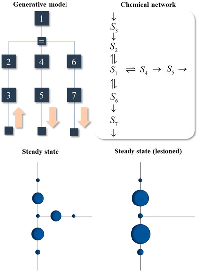 Figure 6. Metabolic networks and their pathologies. This figure shows the conditional dependencies in a generative model in the upper left, highlighting the directional influences at the lowest level of the model with pink arrows. These ensure S3 is a sensory state, while S5 and S7 are active states. In the upper right is the chemical message passing that solves this model. The two plots in the lower part of the figure illustrate the relative probability of the marginal probabilities (or concentrations) of each chemical species. The spatial configuration matches that of the network in the upper right. The sizes of the circles indicate the relative concentrations once steady state has been attained. The plots on the left and right show the steady states before and after introduction of a lesion that disconnects the reaction from S1 to S4. Here, we see a redistribution of the probability mass, resulting in an alternative (possibly pathological) steady state.