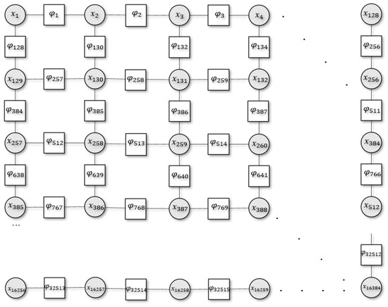 Schematic illustration of the 2D system with a set of discrete random variables where . Here, the circles denote the variable node for each variable (), squares denote the factor nodes (), and edges connect the variable node to the factor .