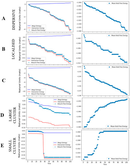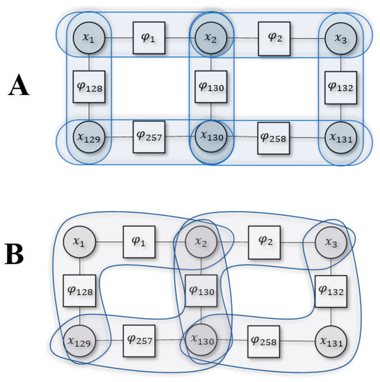 where the Hamiltonian is defined as the sum of its factors, , under a factor graph probability distribution function (Figure 1). Conversely, we could consider more complicated factorisations, like structure mean-field approaches [29], Bethe free energy [15,30], or Kikuchi free energy approximations or a cluster variational method [16,17], which can provide more accurate approximations. Interestingly, the Kikuchi free energy is a generalisation of the Bethe free energy, using higher-order approximations [17].