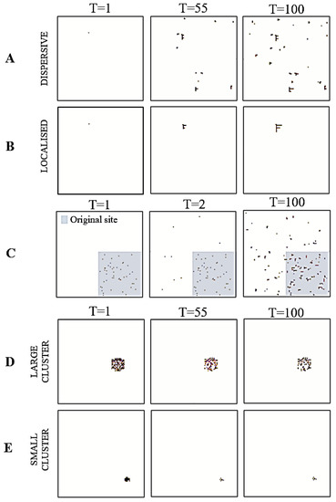 Simulating cancer niches. The figures are pictorial representations of the cancer niches in different trials during simulation. Each row denotes a different simulation: local growth (A,B), metastasis (C), and apoptosis (D,E). For row C, the grey square represents the original site location.