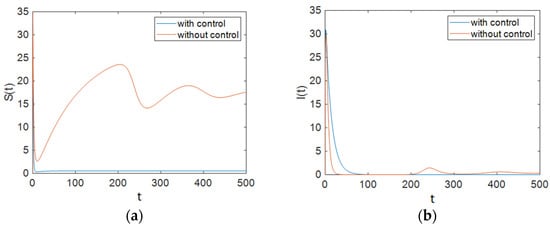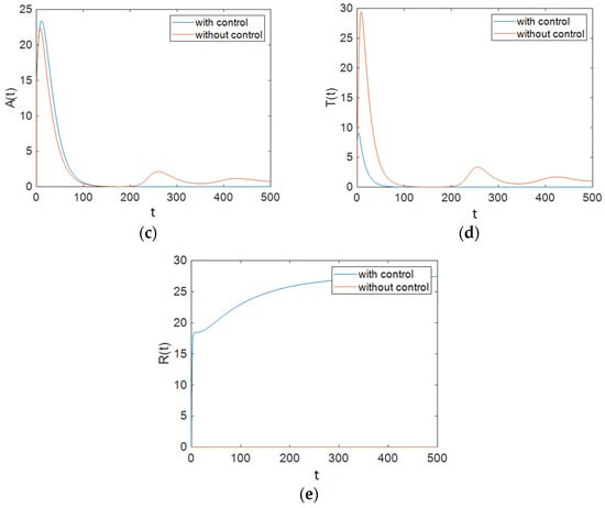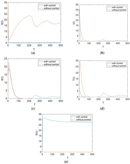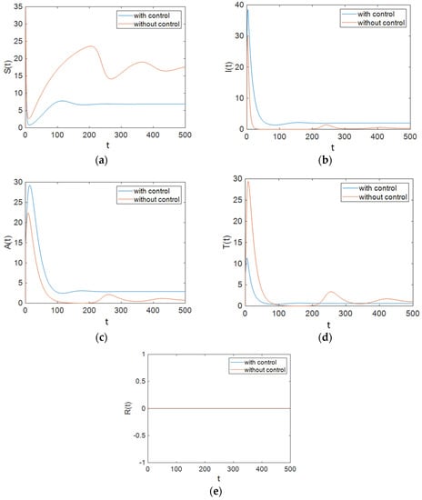 In this section, the behavior of the system was simulated for the case in which and are used to control the ART rate in the treated compartment per unit time and the proportion of susceptible people who have changed their sexual habits per unit time. The simulation results show the effectiveness of controlling the aforementioned parameters. Figure 4 shows that the population of susceptible people decreased significantly compared to the case with no control effort on the system, and it also shows that the number of people with full-blown AIDS did not change greatly from that in the case with no control effort. However, it can be observed that the population of the treated compartment reached zero over time. Furthermore, it can be seen that the number of people in the removed compartment increased remarkably.