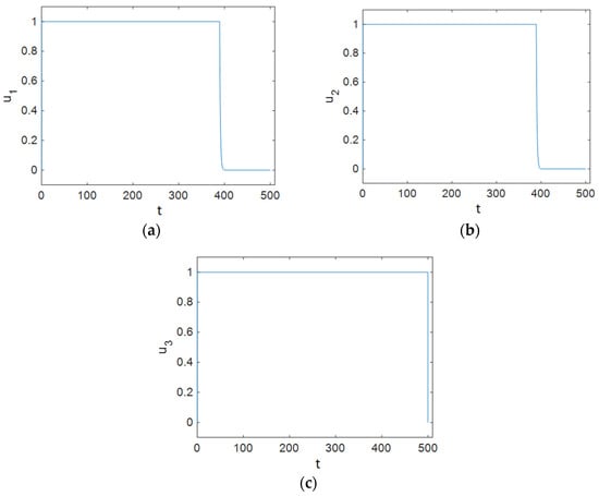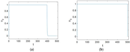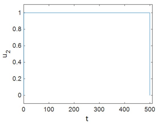 Also, the Lagrange multiplier vector must satisfy Equation (29). Using Equation (30), the optimal controls are obtained as follows: