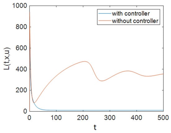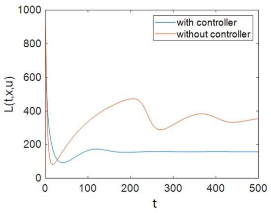 It can be seen in Figure 2 that control efforts were at 0 for approximately 100 days, and then they increased and reached 1; again, after a period of time, they returned to 0 linearly, and as is obvious, at the end of the simulation the control efforts had reached a zero value. It should be noted that for the simulations of the system without a controller, the values of control inputs were considered to be constant at . Figure 3 depicts the time history of function L when Strategy A was applied to the system. Based on Figure 3, the optimal controller effectively reduced function L. As shown in Figure 1, this strategy (only the use of ART) could not improve the situation for all groups. Therefore, we need to apply prevention actions with ART, which are investigated in the next sections.