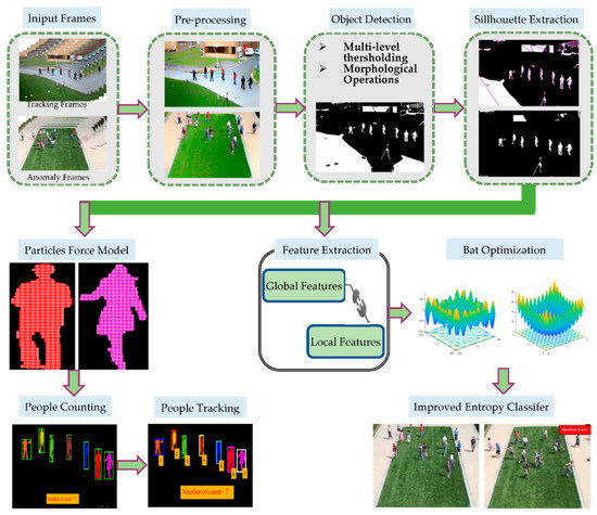 This section elaborates our proposed methodology for multi-person tracking and crowd behavior detection. We propose a robust multi-person tracking system based on a particles force model and human crowd behavior detection system using an improved entropy classifier with spatio-temporal and particles gradient motion descriptors. In the proposed system, the first step is the preprocessing of extracted video frames from a static camera. Secondly, object detection is transacted using multi-level thresholding, morphological operations, and labeling. Thirdly, for human silhouette extraction, a distance algorithm is applied, and non-human filtering is performed on all extracted labeled objects. At this stage, we administered our work into two streams: the first was for multi-person counting and tracking, where we first performed a human silhouette verification step by converting extracted objects into particles and a robust particles force model was introduced for human silhouette verification. In the next step, after verification of human silhouettes, as all verified human silhouettes are a collection of particles, by treating each group of particles as a cluster we performed labeling and cluster estimation using a K-nearest neighbors searching algorithm for multi-person counting. After that, for multi-person tracking, the position of each detected human silhouette was then located and locked by assigning an integer ID for temporally fixing each human silhouette in the full video, and detected fixed humans were tracked using a Jaccard Similarity Index. However, in the second facet, for crowd behavior detection, the extracted foreground objects were passed through a feature extraction step and multiple distinguishable global and local features were extracted from every frame. After that, all the extracted features were standardized using the bat optimization algorithm. Lastly, in the classification phase, an improved entropy classifier was proposed for detection of crowd behavior. Figure 1 depicts the synoptic schematics of our proposed system.