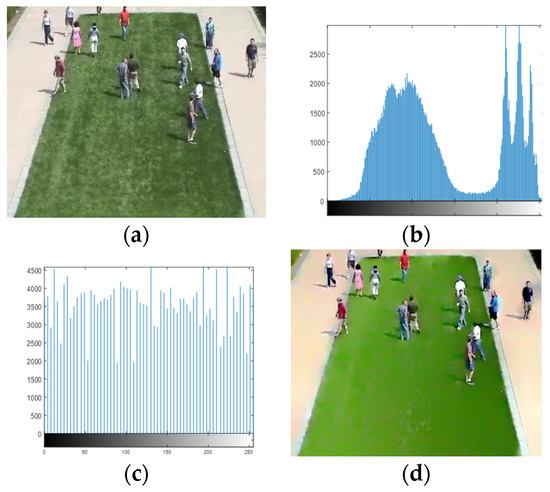 Preprocessing steps. (a) Original color frame of a video, (b) histogram of original image, (c) histogram of enhanced image, and (d) enhanced image.