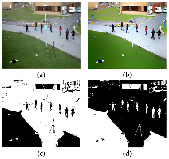 Object detection steps. (a) Original color frame of a video, (b) enhanced image, (c) binary image after multi-level thresholding, and (d) inverse of a threshold image.
