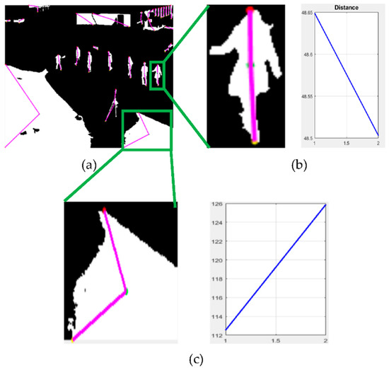 Human silhouette extraction. (a) Distance algorithm from the center to two extreme points for every object, (b) single silhouette extracted uniquely through labeling, along with its distance graph, and (c) a single non-silhouette, along with its distance graph.