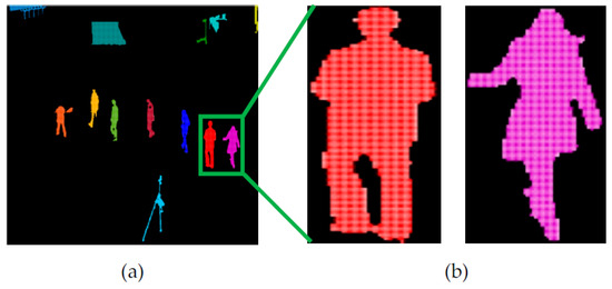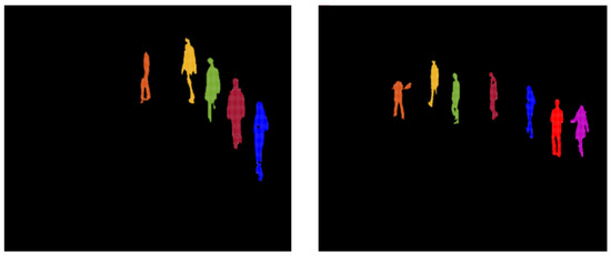 After calculating the distances, those objects whose distances were greater than the set threshold were discarded using Equation (9), and only silhouettes resembling humans were retained.