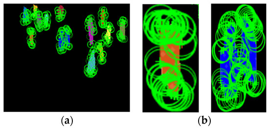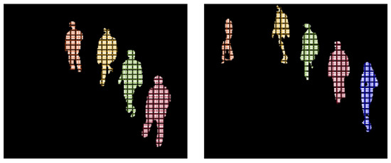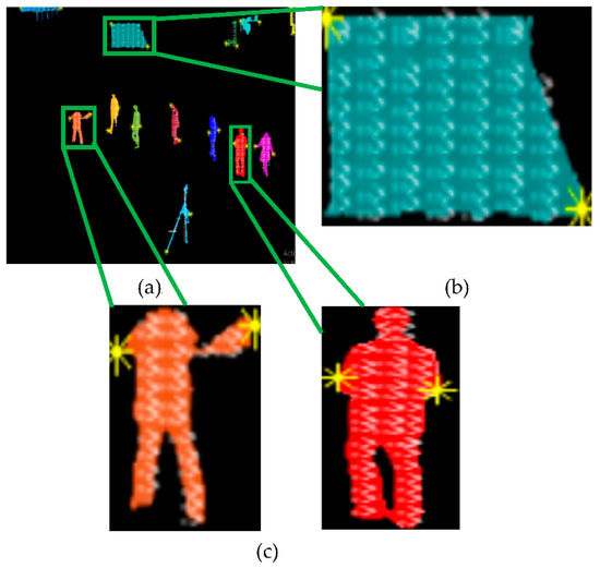 After extraction of the verified human silhouettes, to count these detected humans silhouettes, which consist of a set of particles, we performed cluster estimation. Since every silhouette is a collection of particles, the group of particles that makes one silhouette was treated as one cluster, and, by using the K-nearest neighbor search algorithm, cluster estimation was performed on every frame, as depicted in Figure 8: