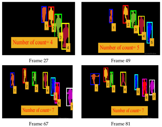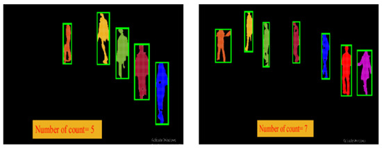 After that, we labeled clusters in all frames, as shown in Equation (12), and, to make them appear visually, we drew green bounding boxes around each cluster. Thus, by performing cluster estimation and labeling, we counted all the extracted human silhouettes, as shown in Figure 9: