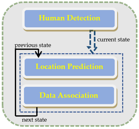 While using data association and cross-correlation as a cost function, detected and predicted persons were associated in consecutive frames, as represented in Figure 10. The root steps involved in multi-person tracking are illustrated in Figure 11.