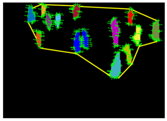 Initially, in global features, we found the center of each human and considered all the humans in the scene as a vertex; this can be denoted as P = {P1, P2, …, Pn|Pi = (Xi, Yi)}, where P represents the whole human crowd in the scene, considered as a set of vertices, and (Xi, Yi) are the coordinates of the ith human. We considered only those humans that were at the extreme points and joined them with a line, forming the biggest graph, covering all extreme vertices, as shown in Figure 12. The graph represented the human crowd contour, and thus, the variations in the shape of a graph threw a flash on variations in the outer area of the human crowd, i.e., on global changes. To measure the variations in the crowd contour, we compared the contour temporally by integrating over all of the pixels of the contour. In general, we defined the (p, q) moment of a contour as in Equation (14):