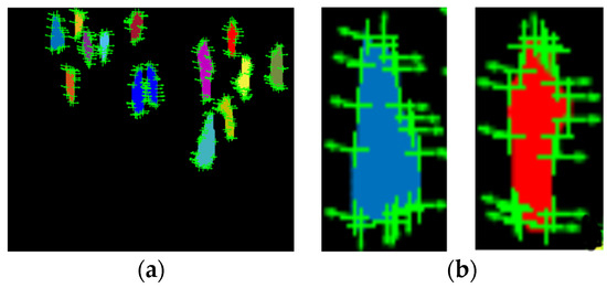 We present a robust particles force model for human silhouette verification. First of all, every extracted labeled silhouette was converted into particles, as shown in Figure 5a. We treated all pixels as fluid particles, thus, every extracted silhouette was a collection of many particles, as depicted in the magnified view in Figure 5b. Therefore, in our designed method, each silhouette was represented by a set of particles Q = [,,, …,], where N is the total number of particles in one silhouette.