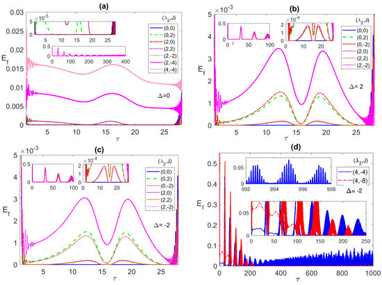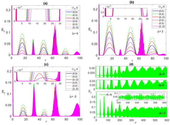 In Figure 1b, we consider an out of resonance case, with positive detuning . For non-interacting atoms, with parameter values (0,0), the ESD sustains over the entire time period (blue line) from about 2 to 27. However, turning on FM (or AF) Ising has a strong impact on the ESD compared with the case, where setting the parameters at removes completely the ESD with the AM entanglement peaks (red line) is slightly higher than that of the FM one (green line). Turning on the dipole interaction while keeping , removes the ESD partially, for (2, 0), and for higher values of , it completely eliminates the ESD and enhances the Entanglement. Adding the AF Ising to the dipole interaction, (2, 2), does not have a large impact on the entanglement behavior except for a slight shift (brown line). However, adding the FM Ising removes the ESD and enhances the entanglement significantly, even for parameter values as low as (2, ) (magenta line). Increasing the value of (FM) J further increases the entanglement considerably (not shown here). The entanglement dynamics for negative detuning, , illustrated in Figure 1c, does not exhibit notable differences from the positive detuning case, , except the peaks (green line) for (0, 2) is slightly higher, this time, than that of (0, ) (red line), and so is (2, 2) compared to (2, 0). It is essential to investigate the effect of the different system parameters on the asymptotic behavior of the entanglement between the two atoms, which is considered in Figure 1d. While, as we concluded from Figure 1a–c, combining the dipole–dipole and FM Ising interactions is very effective in eliminating the ESD and enhancing the entanglement in the first period, it is clear from panel (d) that setting the parameter values even at (4, ) can remove the ESD from the first and second periods but not the latter ones. In fact, the entanglement exhibits asymptotically an irregular oscillation interrupted with persistent ESD small periods, as shown in the upper inset of panel (d). Applying higher values of the parameters, such as (4, ) (green line), may remove the ESD in more early periods, as shown in the lower inset of panel (d), however, it causes the entanglement to vanish entirely asymptotically.