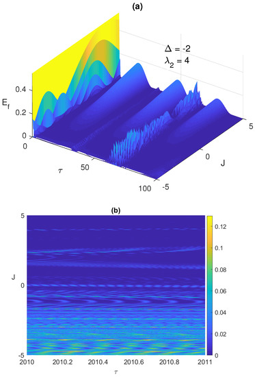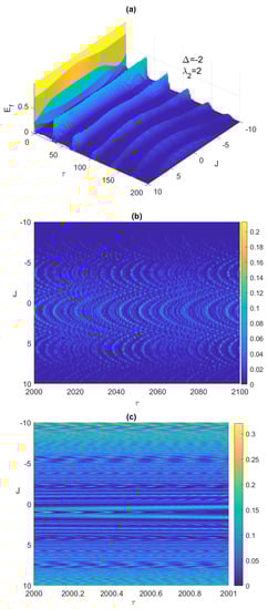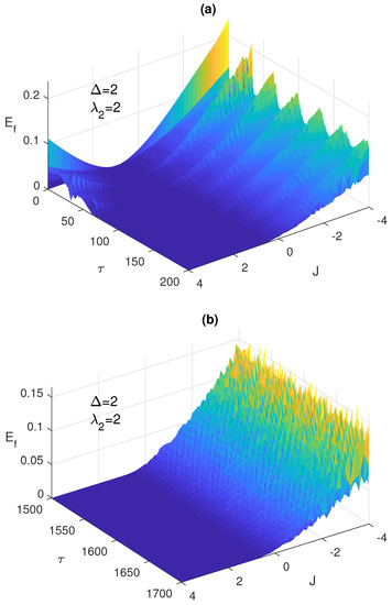 It is always very insightful to monitor the system dynamics using 3-dimensional plots, which shows the behavior of the system over a wide continuous range of the parameter values. In Figure 2a,b, we depict the time evolution of the entanglement versus the Ising coupling parameter, where at early times and asymptotically, respectively. As can be noticed, increasing the Ising coupling value may remove the ESD at early times as shown in Figure 2a, but eventually causes the entanglement to vanish completely without revival as illustrated in Figure 2b, where the ESD period length increases with J until eliminating the entanglement completely. Testing the system dynamics starting from another maximally entangled state, the Bell anti-correlated , showed slight differences but not that significant, in the behavior of the entanglement, ESD, and the atomic population compared with the correlated Bell state at the early times, however, asymptotically the ESD can be removed entirely from the system by increasing the Ising coupling value as illustrated in Figure 2c. Interestingly, as can be observed in Figure 2b,c, the entanglement behavior is symmetric as the values of J changes from the positive to the negative values, however, the symmetry center is not but around .