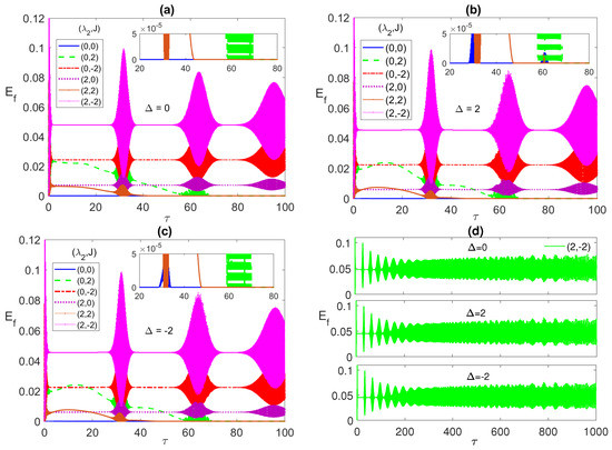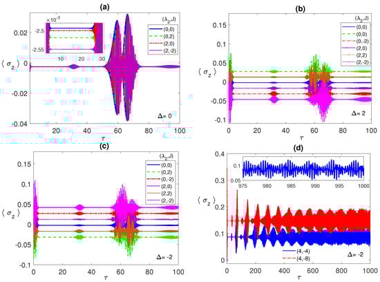 In Figure 3b,c, we discuss the non-zero detuning cases, , and , respectively. Remarkably, there is an inverted symmetry existing when one compares the atomic population in the two cases, where each collapse line at specific parameter values, say (2, ), is far from the (0, 0) line equally for and but at the opposite sides. Furthermore, as we pointed in Figure 3a, the relative separation among the different collapse lines matches the corresponding entanglement values relative separation. Comparing the three different detuning cases, in panels (a), (b), and (c), it is clear that the off-resonance condition splits the collapse lines away from each other considerably compared with the resonance case. The asymptotic behavior of the atomic population is illustrated in Figure 3d at the parameter values (4, ) (blue line) and (4, ) (red line). As can be seen, the collapse periods get shorter with time before disappearing asymptotically and the general profile turns into an irregular continuous oscillation with varying reduced amplitude (as shown in the inset), which indicates a continuous energy exchange between the atoms and the field.
