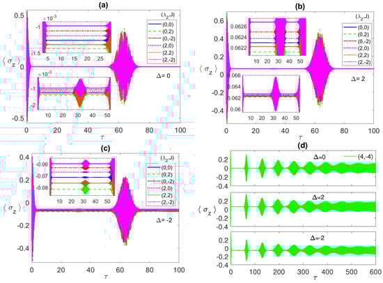 The atomic population is illustrated in Figure 6a–c for the detuning values 0, 2 and , respectively. Again, the separation of the collapse lines from the (0, 0) blue line, at all parameter values match the same one of the lines in the entanglement case, Figure 4. The collapse lines separation from each other increases from to 2 and mostly at . The detuning effect is clear in shifting the collapse lines upwards, for , and downwards, for , compared with the case. Noticeably, the inverted reflection symmetry of the population lines, as we turn from to , that was observed in the Bell state case, in Figure 3, is not seen in the current case. In Figure 6d, we depict the asymptotic dynamics of the population inversion at the parameters choice (4, ), at the detuning values 0, 2 and , respectively, in the top, middle and bottom panels, respectively. As can be seen, in all cases, the collapse periods shrinks until completely disappearing, where the dynamics profile becomes a continuous irregular oscillation, which resembles the entanglement function asymptotic behavior and provides an explanation for it, where the exchange of energy between the two atoms and the field becomes continuous with no interruption, enhancing the mediated entanglement between the two atoms.
